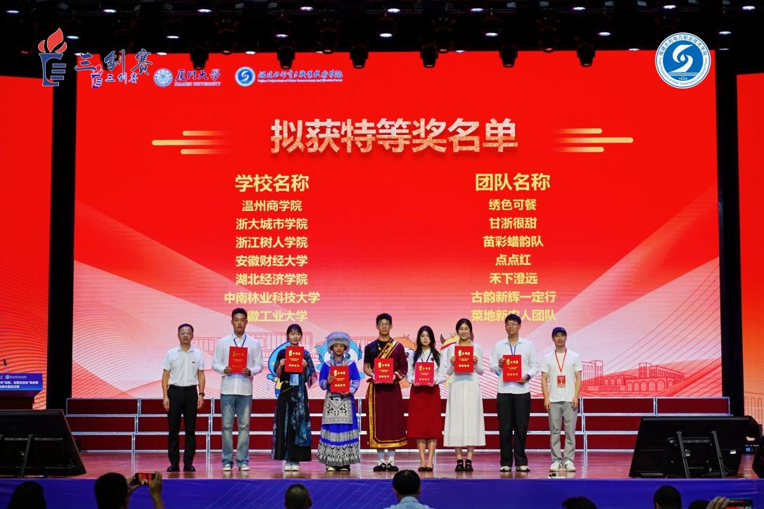 “三创赛”是高校大学生竞赛排行榜竞赛项目中A类赛事。本届乡村振兴实战赛总决赛由全国电子商务产教融合创新联盟主办,厦门大学、福建水利电力职业技术学院承办。在乡村振兴赛道上,全国有31个省、市、自治区、直辖市的高校派出队伍,参赛团队超过2万支;经过省市分赛区的选拔,107所高校的138支团队进入全国总决赛。海洋之神之线路检测中心学子的《乡村新农领航,振兴乡村梦想》项目,聚焦乡村振兴,通过数字技术赋能非遗食品“金菜地茶干”,项目整合生产流程资源,打造“短视频直播带货+私域运营”营销链路,融合AI选品+文创IP等多种创新手段,有效提升产品销量,为乡村企业的数字化转型提供了成功的实践范例。在比赛中,团队成员以丰富的创新创意、亮眼的实战数据、严谨的展示陈述、清晰准确的答辩赢得了评审专家组的一致好评,最终从众多项目中脱颖而出。